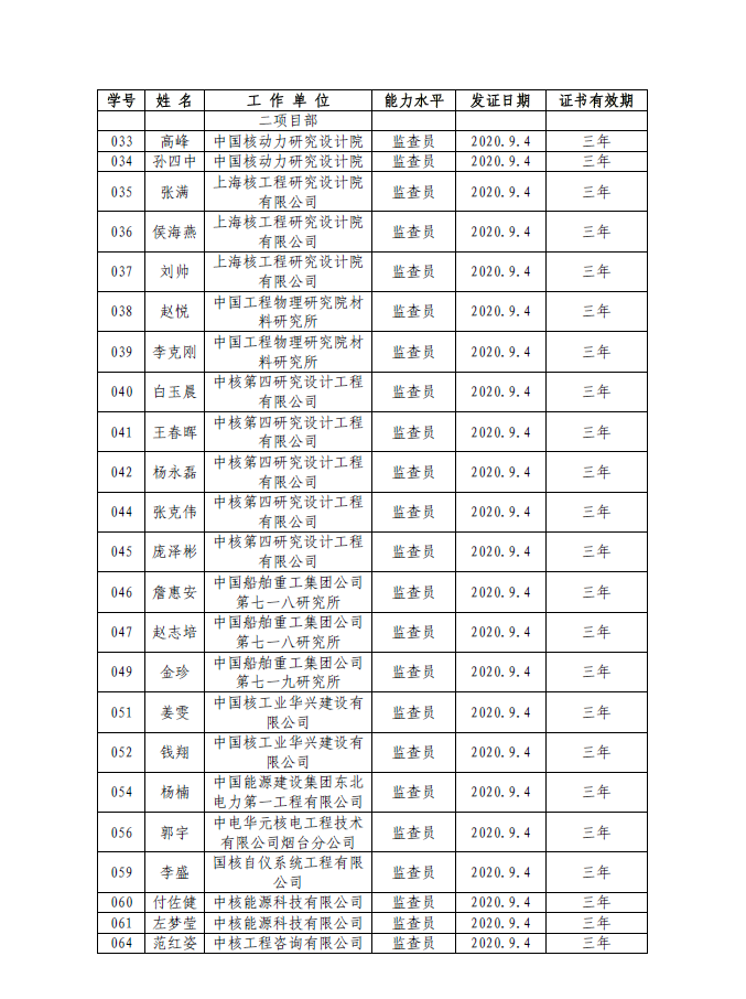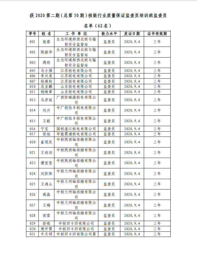 获2020第二期(总第50期)核能行业质量保证监查员培训班监查员名单(62名)