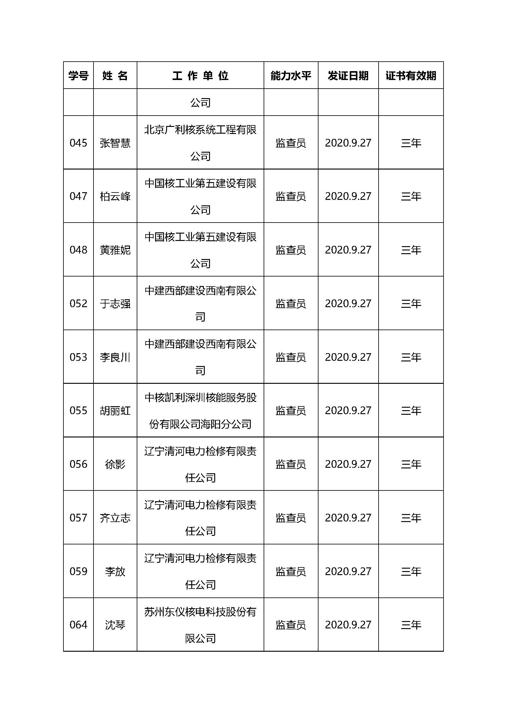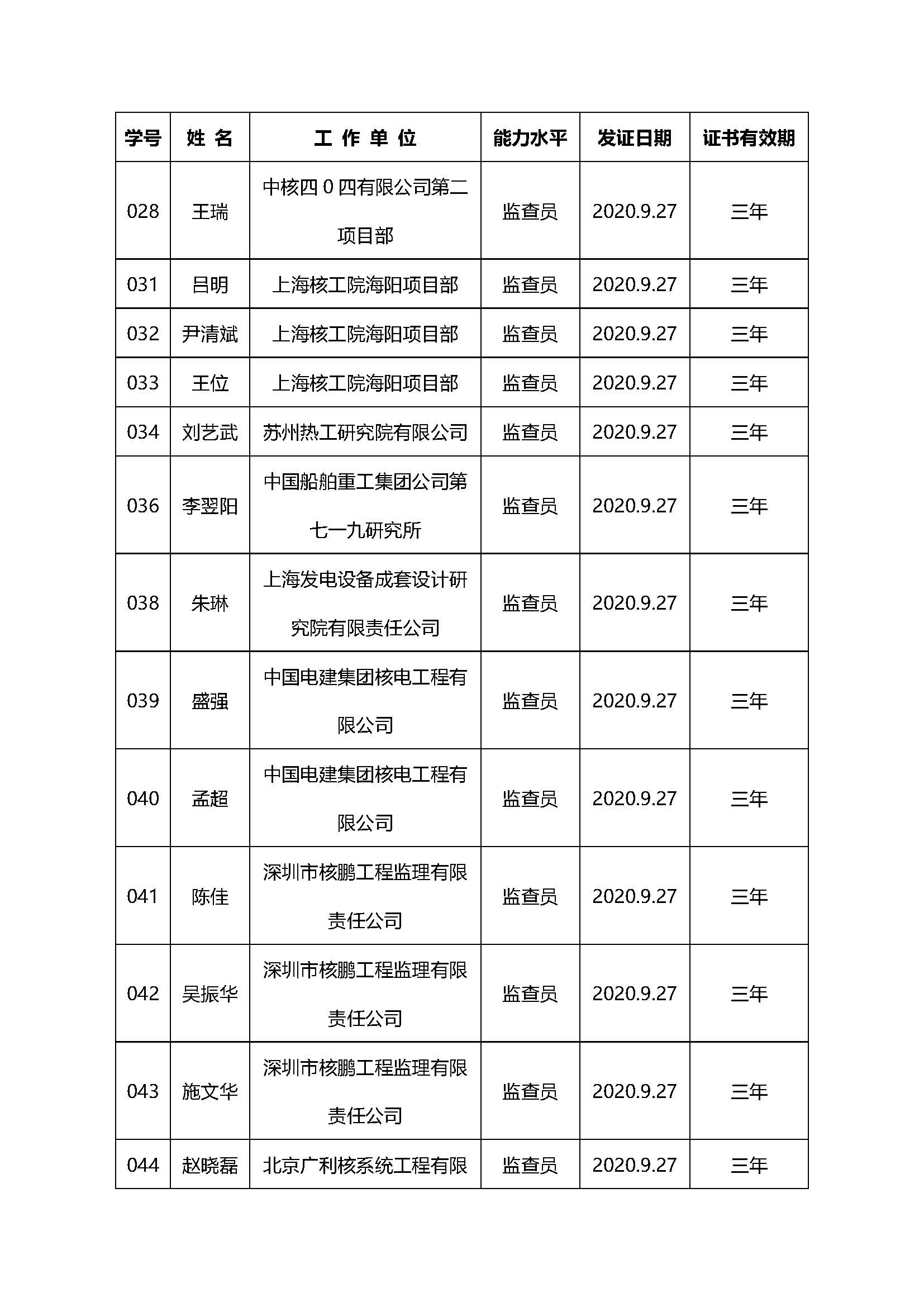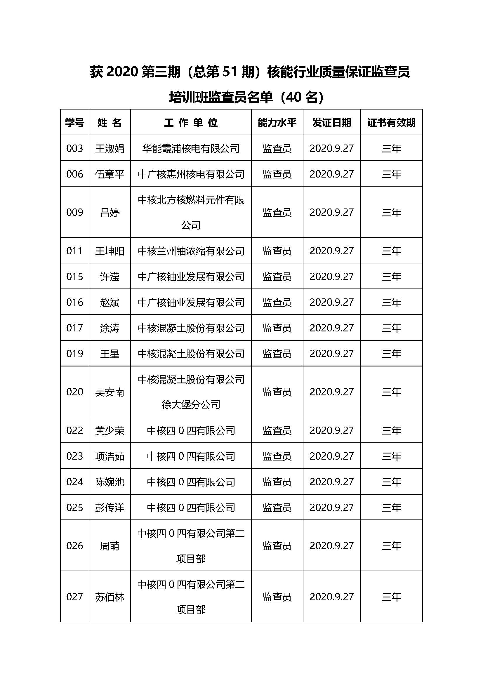 公布2020第三期(总第51期)核能行业质量保证监查员培训班监查员名单