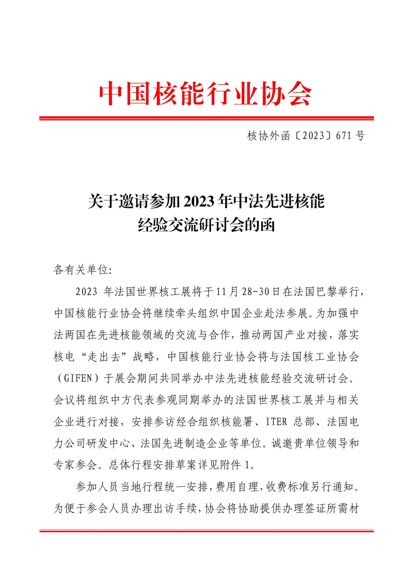 搜狐体育直播:邀请参加2023年中法先进核能经验交流研讨会的函