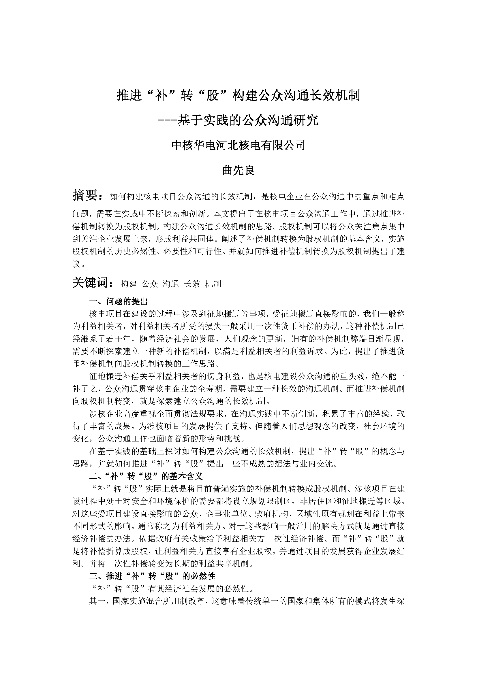 推进“补”转“股”构建公众沟通长效机制---基于实践的公众沟通研究