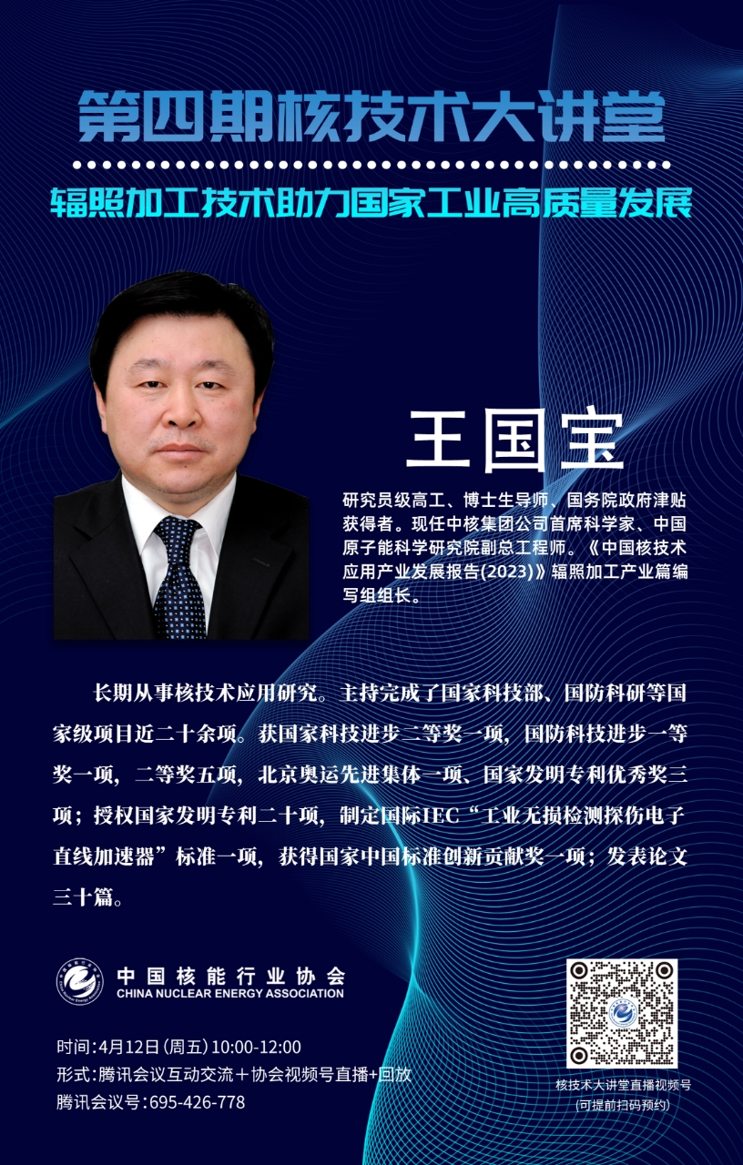 主讲人:王国宝,研究员级高工、博士生导师、国务院政府津贴获得者。中核集团首席科学家、中国原子能科学研究院副总工程师。