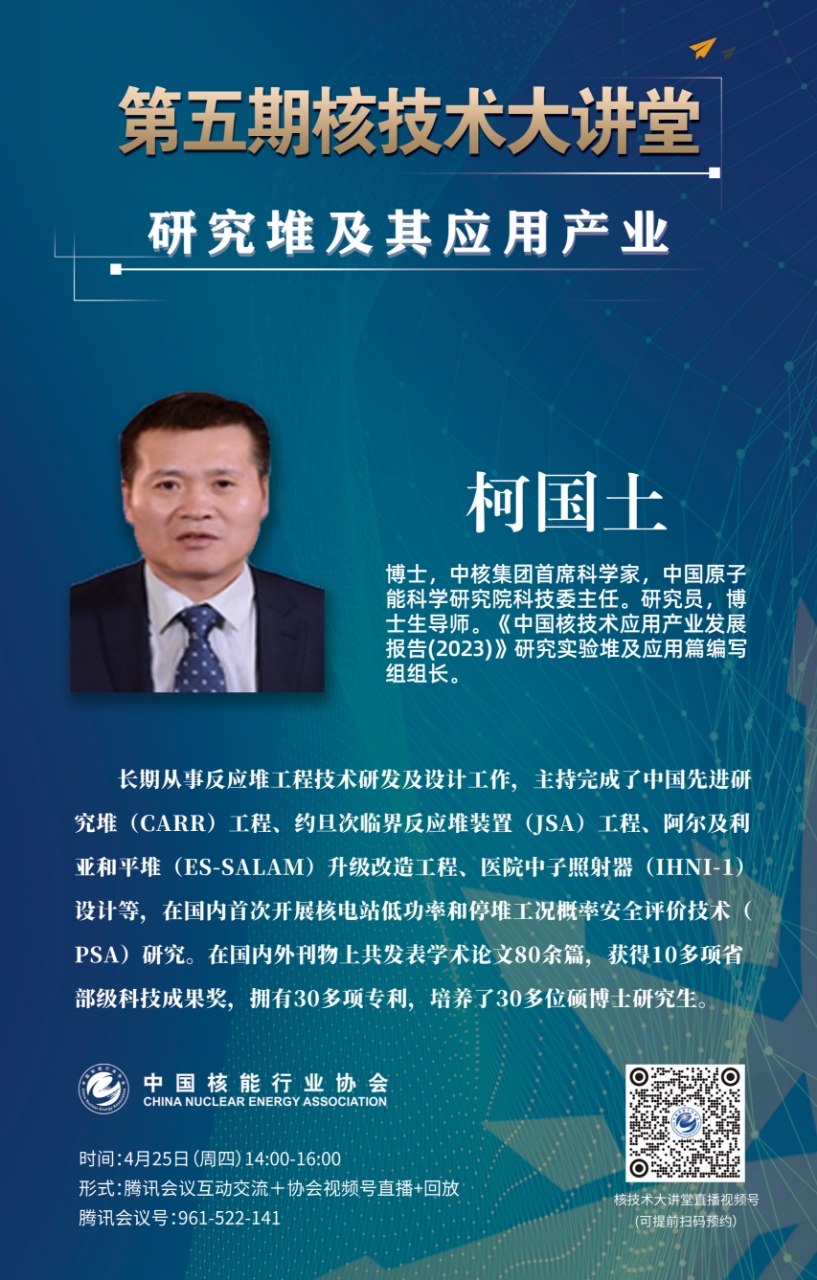 主讲人:柯国土,博士,中核集团首席科学家,中国原子能科学研究院科技委主任,研究员,博士生导师